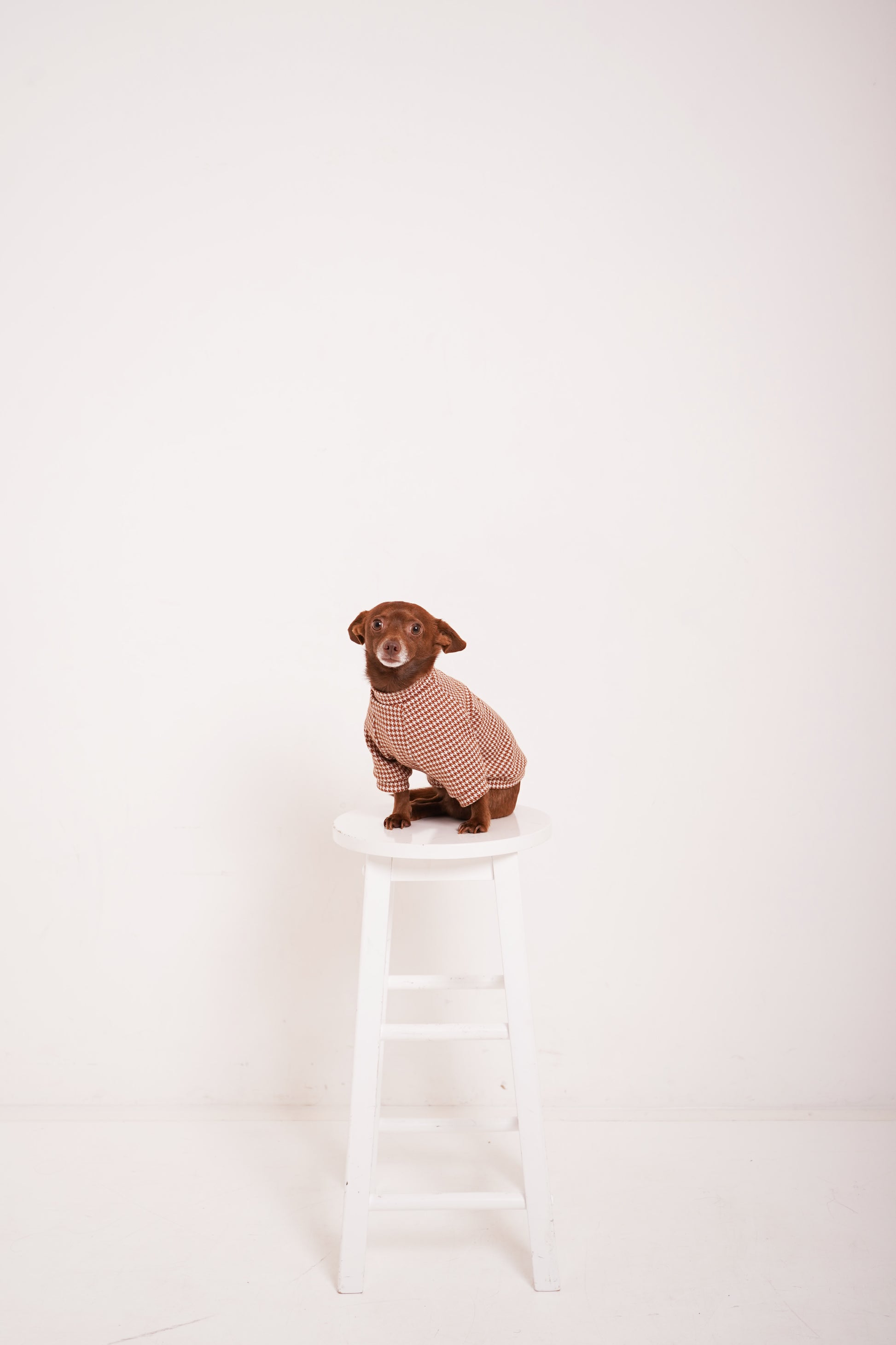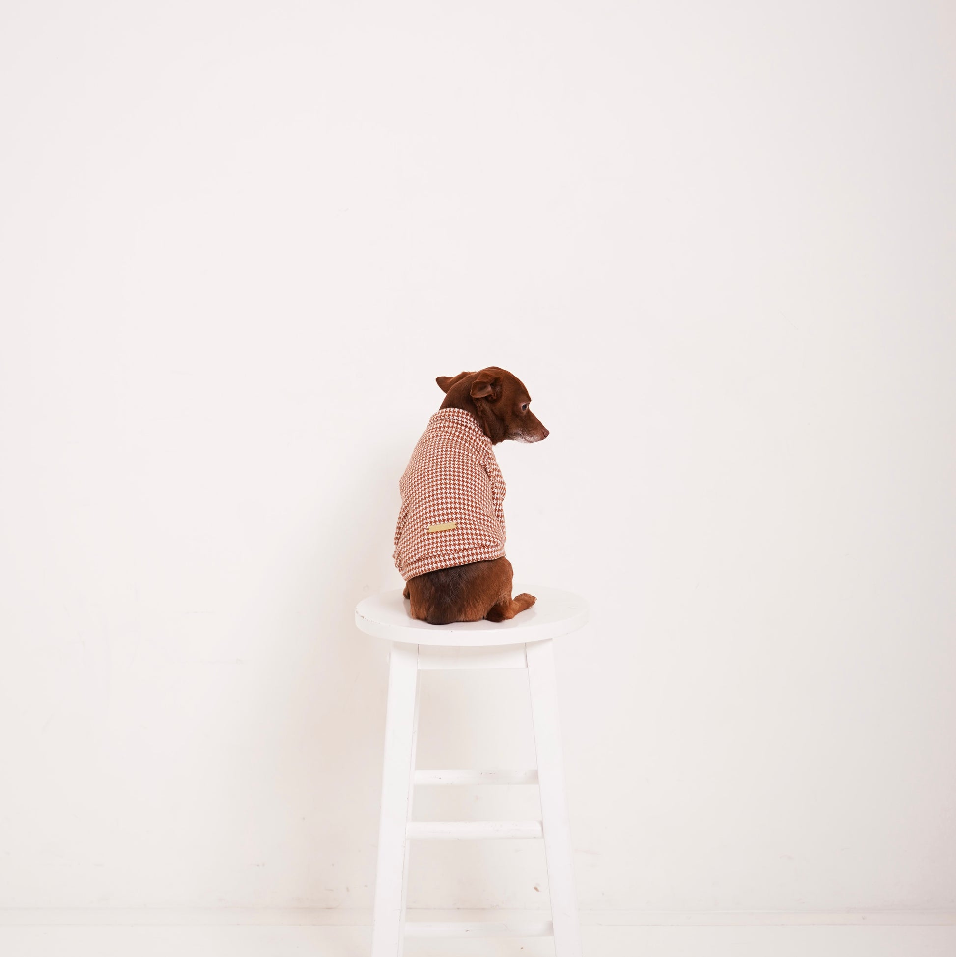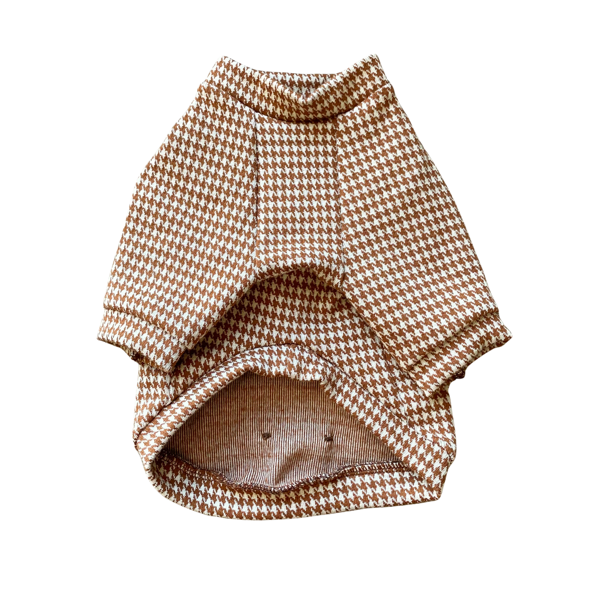 Crafted for comfort and style, this brown houndstooth dog sweater is a perfect addition to our Autumn collection. Made from a stretchy yet sturdy fabric, it offers a snug fit that allows freedom of movement while keeping your pup warm. The long sleeves provide extra coverage for chilly weather, making it ideal for layering during cooler days. Designed to combine classic pattern with practical warmth, this sweater is perfect for small puppies and large dogs alike.